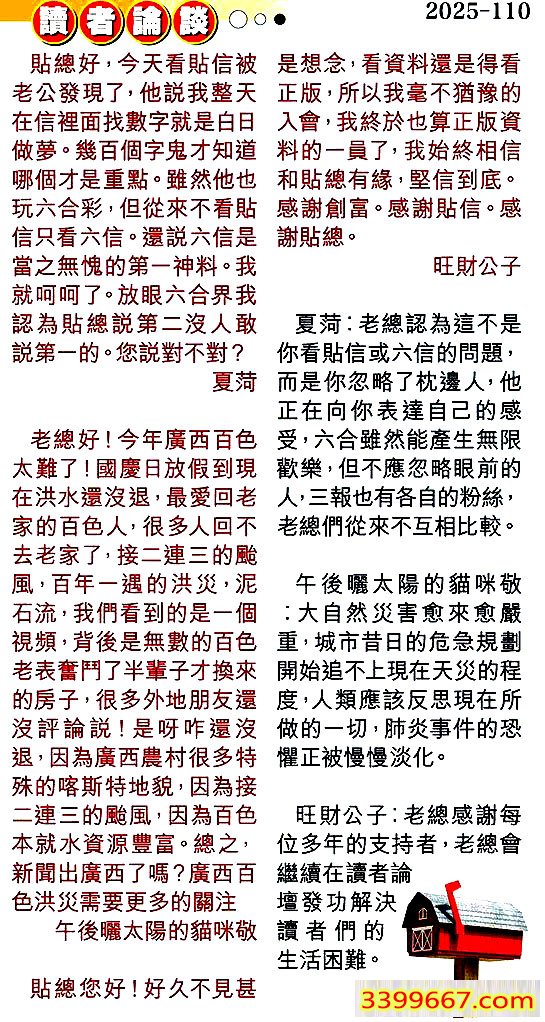 | 主题 :110期:彩民推荐〖貼信讀者論壇〗 |