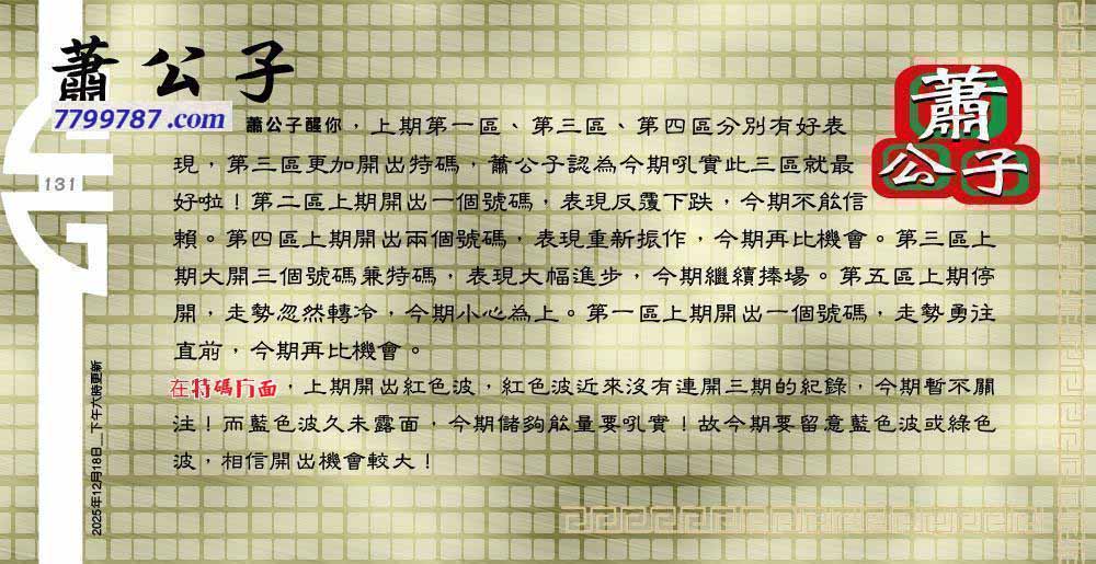 | 主题 :131期:六合皇金句/老总论码/萧公子/林大师/五行夺码/老总信箱截 |