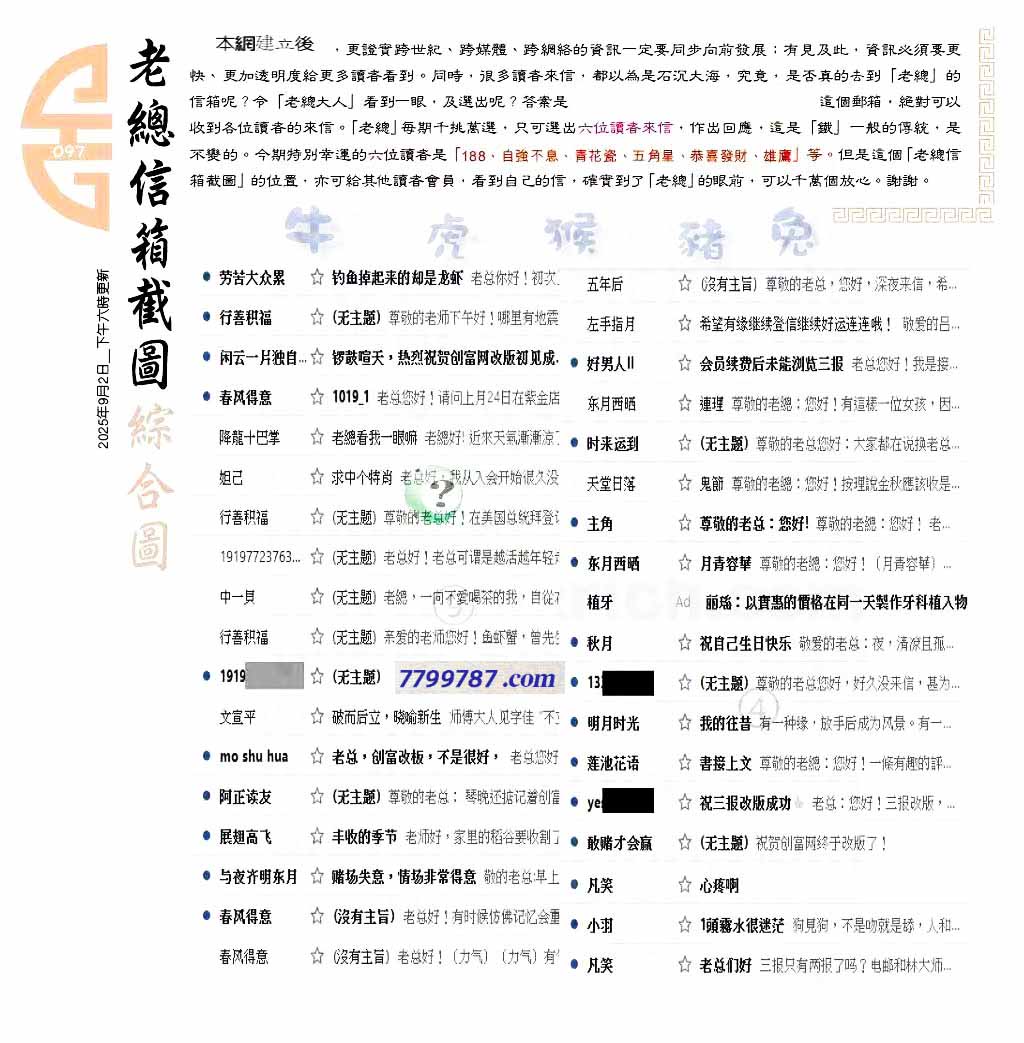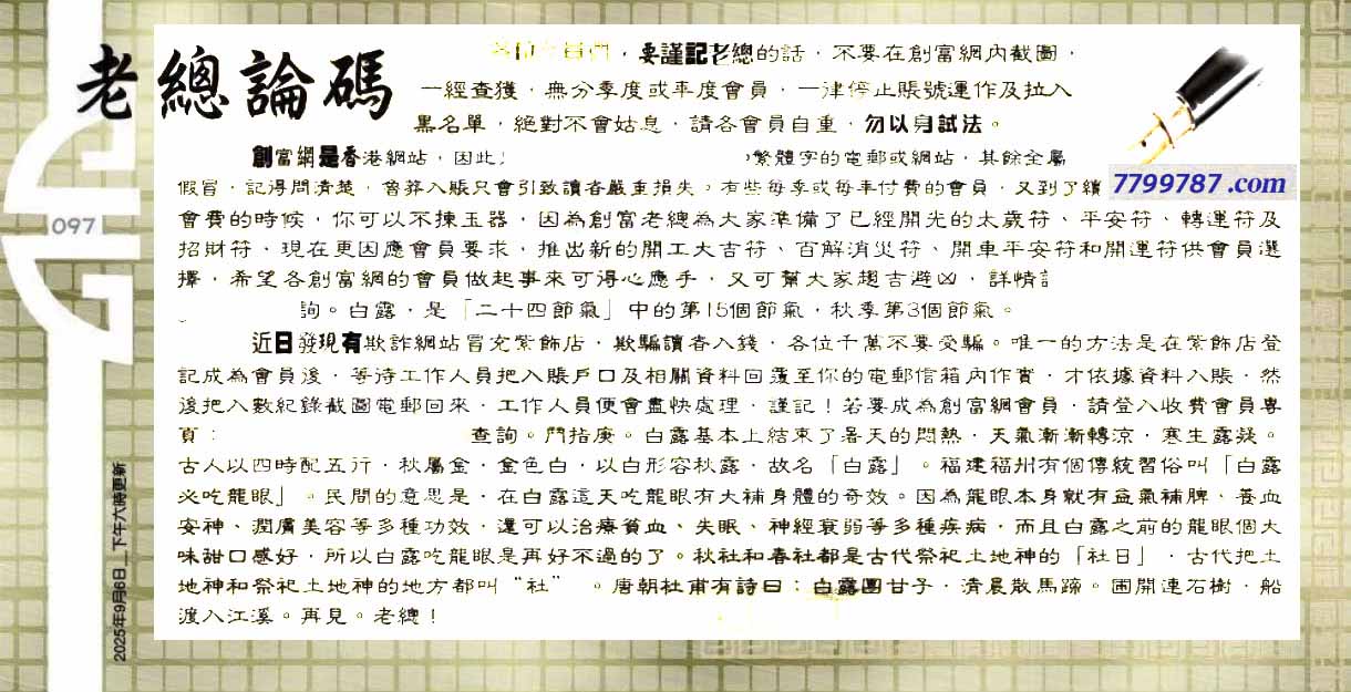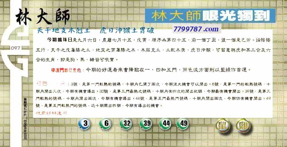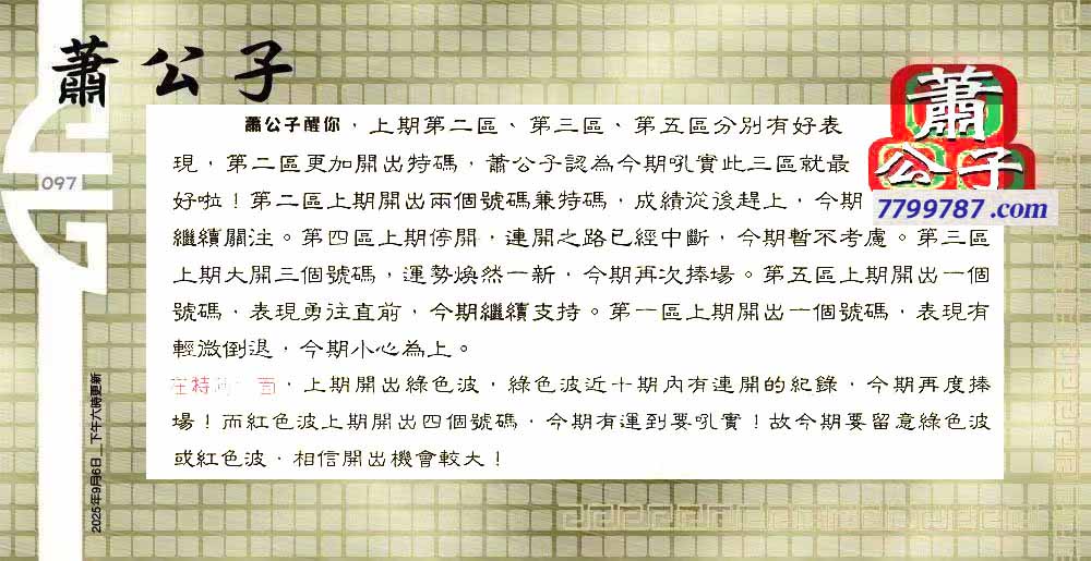 | 主题 :097期:六合皇金句/老总论码/萧公子/林大师/五行夺码/老总信箱截 |