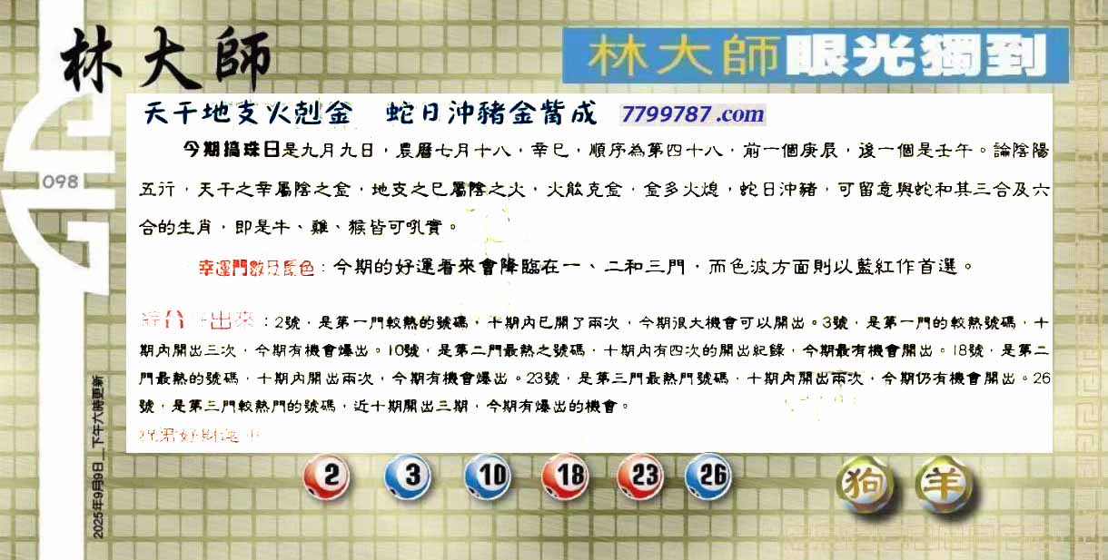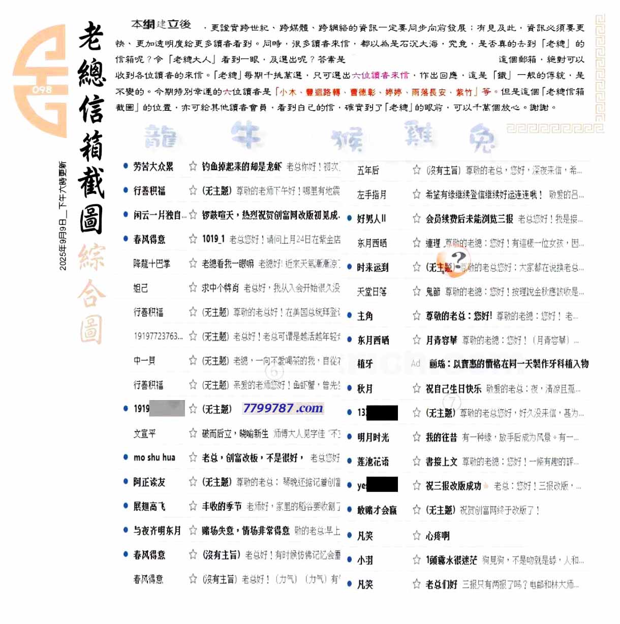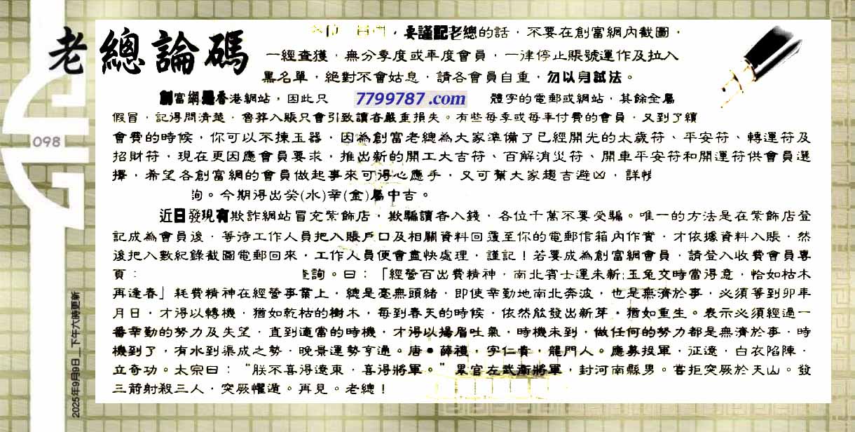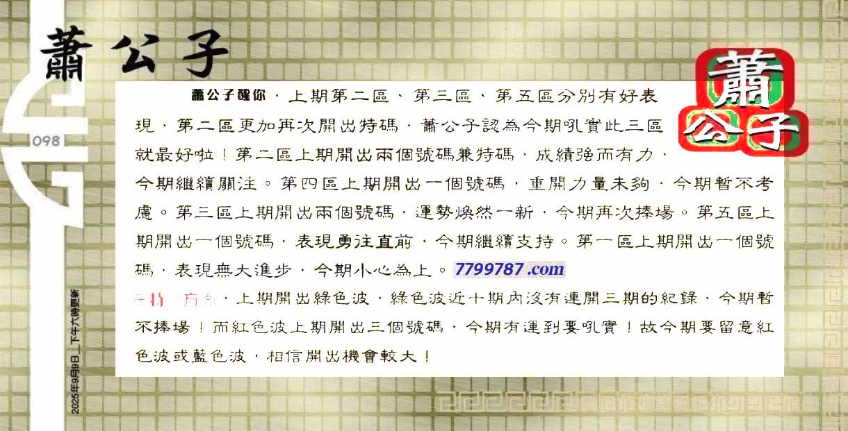 | 主题 :098期:六合皇金句/老总论码/萧公子/林大师/五行夺码/老总信箱截 |