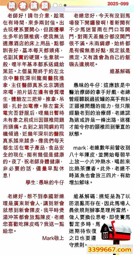 | 主题 :099期:彩民推荐〖貼信讀者論壇〗 |