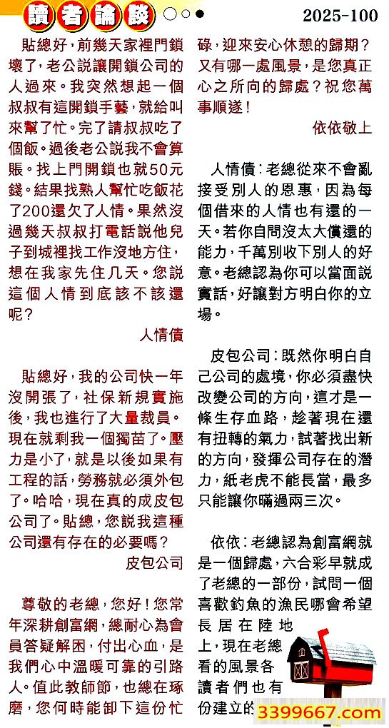 〖依依〗:老總認為創富網就是一個歸處,六合彩早就成了老總的一部份,試問一個喜歡釣魚的漁民哪會希望長居在陸地上,現在老總看的風景各讀者們也有份建立的。