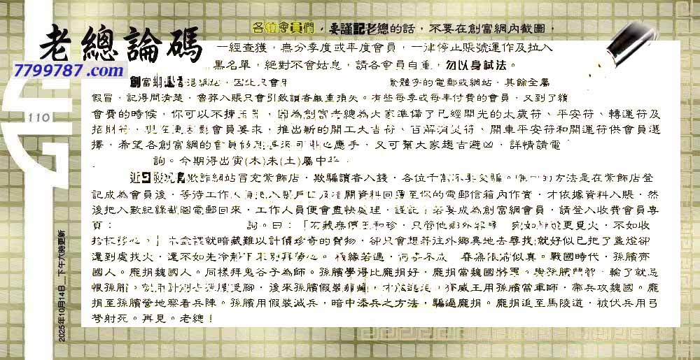 | 主题 :110期:六合皇金句/老总论码/萧公子/林大师/五行夺码/老总信箱截 |