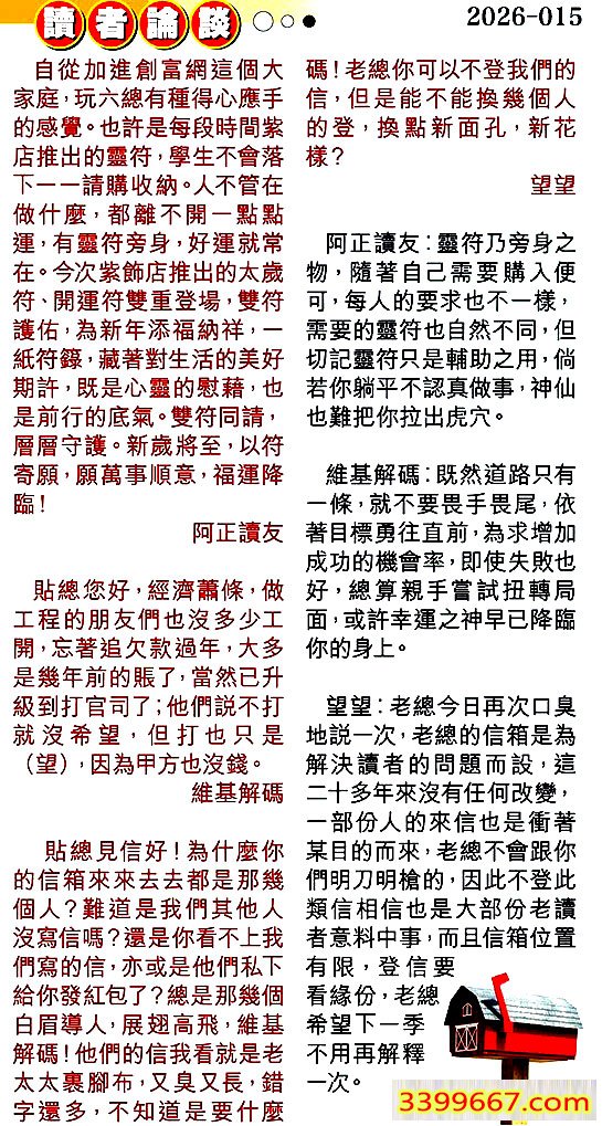 | 主题 :015期:彩民推荐〖貼信讀者論壇〗 |