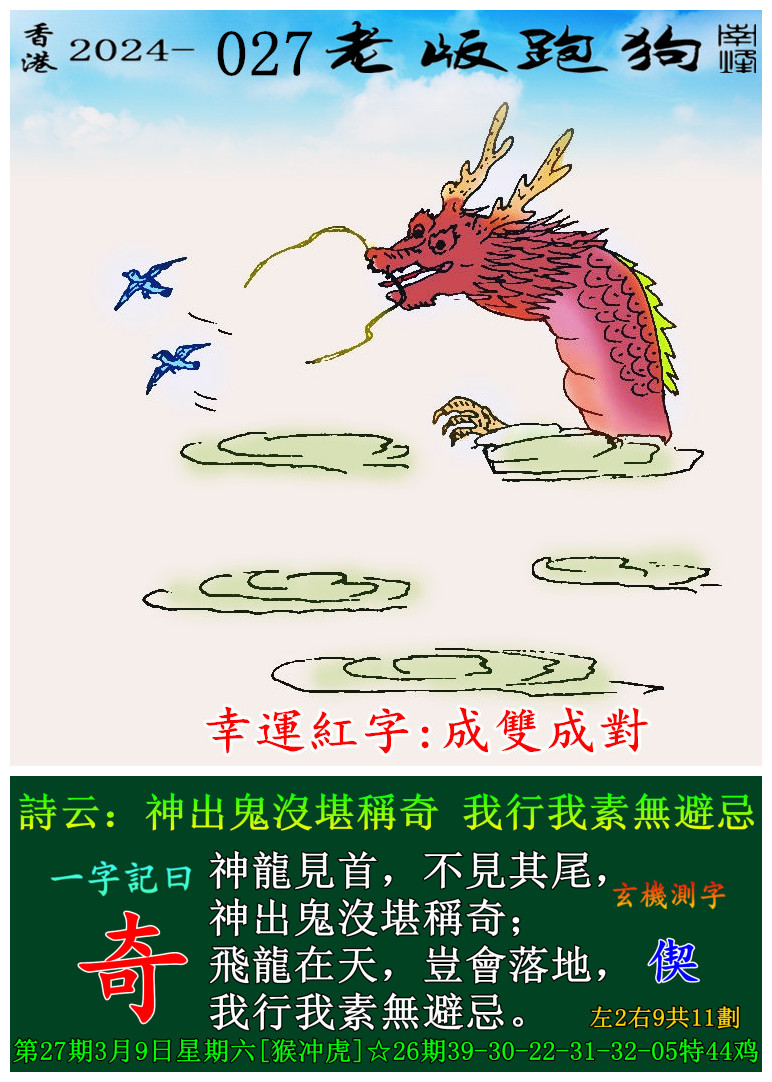 027期老版跑狗一字記之曰:【奇】