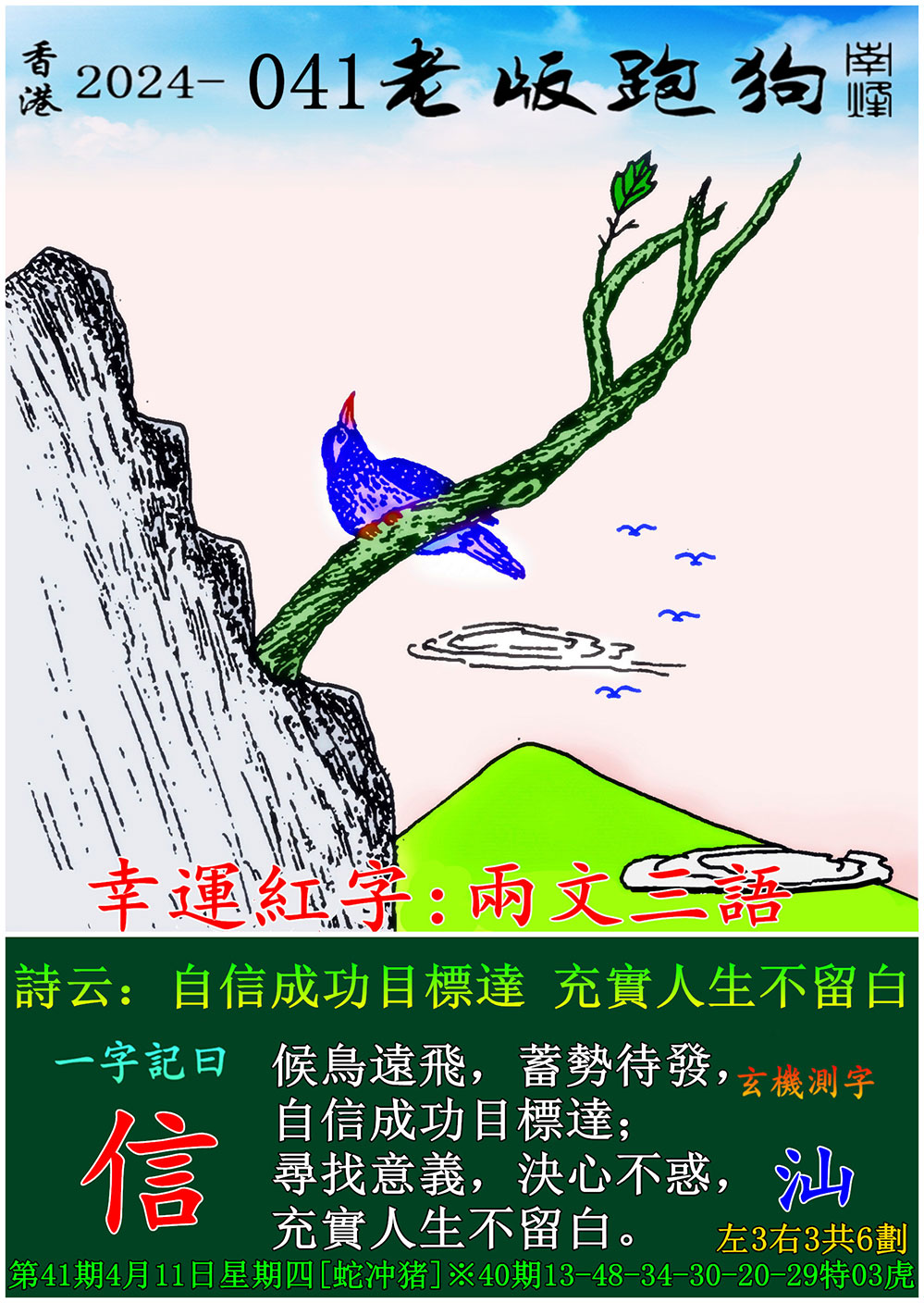 041期老版跑狗一字記之曰:【信】 玄機測字:《汕》