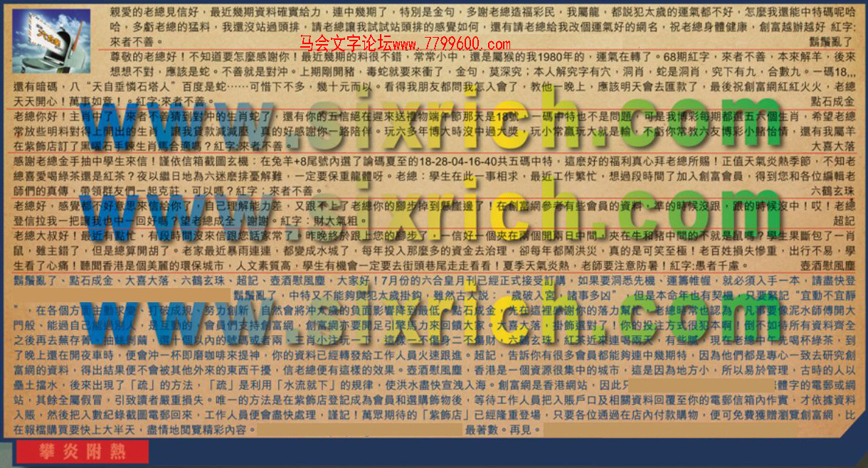 【6】老總大叔好!最近有點忙,有段時間沒來信跟您話家常了。昨晚終於跟上您的腳步了,一信好一個夾在网個開兩日中間,夹在生和豬中間的不就是鼠嗎?學生果斷包了一肖鼠,雖主錯了,但是總算開胡了。老家最近暴雨連連,都變成水城了,每年投入那麼多的資金去治理,卻每年都鬧洪災,真的是可笑至極!老百姓損失惨重,出行不易,學生看了心痛!聽聞香港是個美麗的環保城市,人文素質高,學生有機會一定要去街頭巷尾走走看看!夏季天氣炎熱,老師要注意防署!紅字:患者千慮。 ---壺酒慰風塵