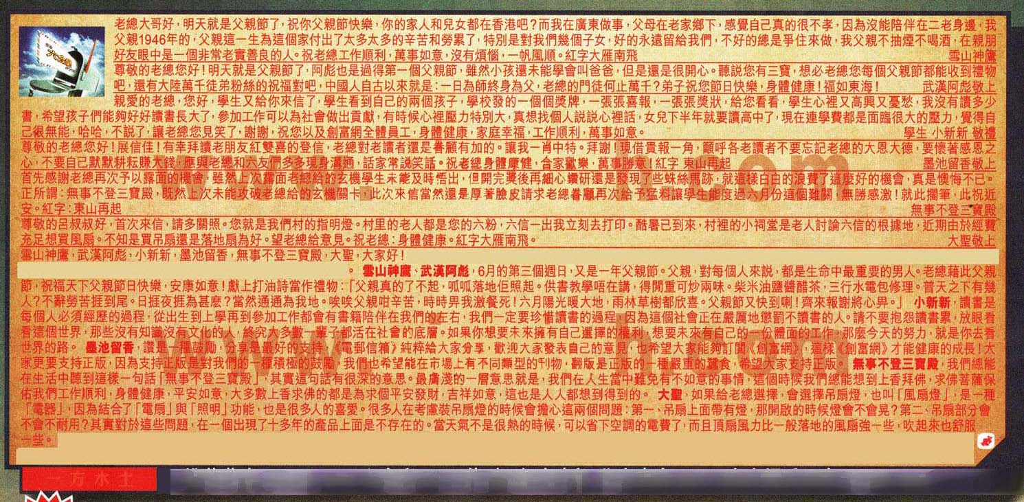 【4】尊敬的老總您好!展信佳!有幸拜讀老朋友紅雙喜的登信,老總對老讀者還是眷顧有加的。讓我一肖中特。拜謝!現借貴報一角,籲呼各老讀者不要忘記老總的大恩大德,要懷著感恩之心,不要自己默默耕耘賺大钱,應與老總和六友們多多现身溝通,話家常說笑話。祝老總身體康健,合家歡樂,萬事勝意!紅字東山再起 ---墨池留香敬上