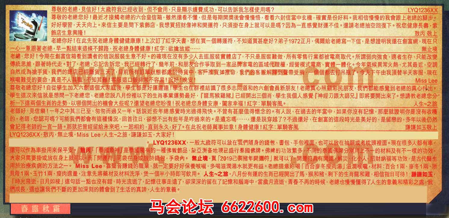 【5】尊敬老總您好!自從學生加入六創這個大家庭後,學生都是好運連連!學生也在群裡結識了很多志同道和的六創會員新朋友!老總真心照顧彩民朋友,我們都能感覺到老總的真心付出。學生這次來信就是想問一下老總您,老總您說八月份裡以下的生肖事業運勢最好,「龍馬猴雞豬」已經開出三個肖, 學生我個人感覺「神經刀跟大師兄」即將要開出來了。想請教老總您分析一下這兩個生肖的走勢,以哪個開出的機會大些呢?還望老總您盼復!祝老總您身體安康,闔家幸福!紅字:單騎客風。 --- 人生~之旅
