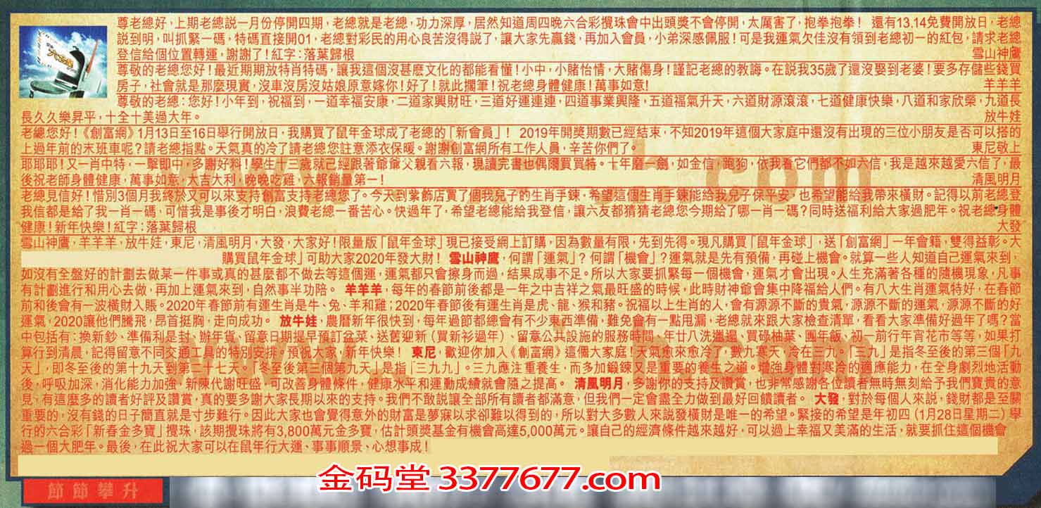 【4】老總您好!《創富網》1月13日至16日舉行開放日,我購買了鼠年金球成了老總的「新會員」! 2019年開獎期數已經結束,不知2019年這個大家庭中還沒有出現的三位小朋友是否可以搭的上過年前的末班車呢?請老總指點。天氣真的冷了請老總您詿意添衣保暖。謝謝網所有工作人員 ;辛苦你們了。東尼敬上