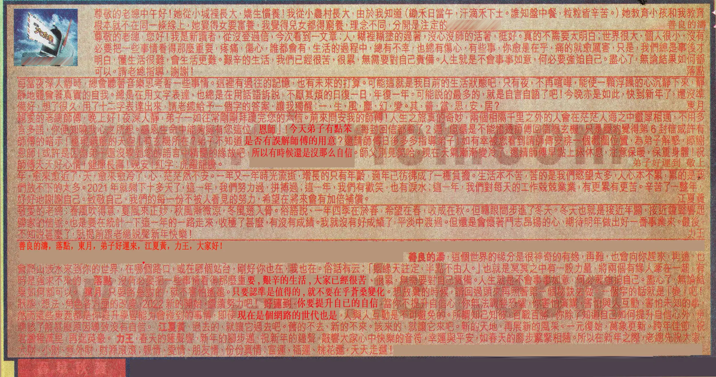 【4】. 親愛的老總師傅,晚上好!夜深人靜,弟子一如往常剛剛拜讀完您的六信。前來問安我的師傅!人生之旅真的奇妙,兩個相隔千里之外的人會在茫茫人海之中靈犀相通,不用多言多語,你便知曉我心之所想。感恩生命中能夠擁有您這位「恩師」!今天弟子有點笨,每封回信都看了2遍,但還是不能悟透師傅回信裡玄機,只是隱約覺得第6封信或許有師傅的暗示「重現蔚藍的天空」有玄機所在?弟子不知道是否有誤解師傅的用意?還請師傅日後多多指導弟子!如有幸被您看到請師傅安排一個截圖位置,為弟子解惑,感謝恩師!或許是因爲弟子還沒學到您的語言中精髓的緣故吧,所以有時候還是沒那麽自信。師父別見笑哈。現在天氣漸漸變冷了,還請師傅早點上床休息,注意保暖,保重身體!祝師傅天天好心情!健康長壽!晚安!紅字:虎躍龍騰。  弟子 好運到 敬上