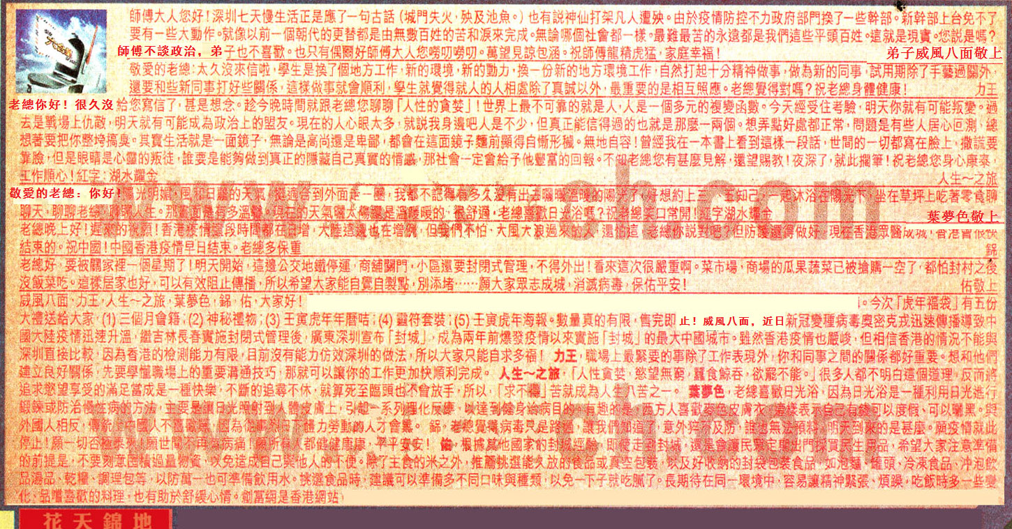 【5】. 老總晚上好!遲來的祝願!香港疫情這段時間都在日增,大陸這邊也在增例,但我們不怕,大風大浪過來的人,還怕這,老總你說對吧?但防護還得做好,現在香港眾醫成城,香港會很快結束的。祝中國!中國香港疫情早日結束。老總多保重  銱