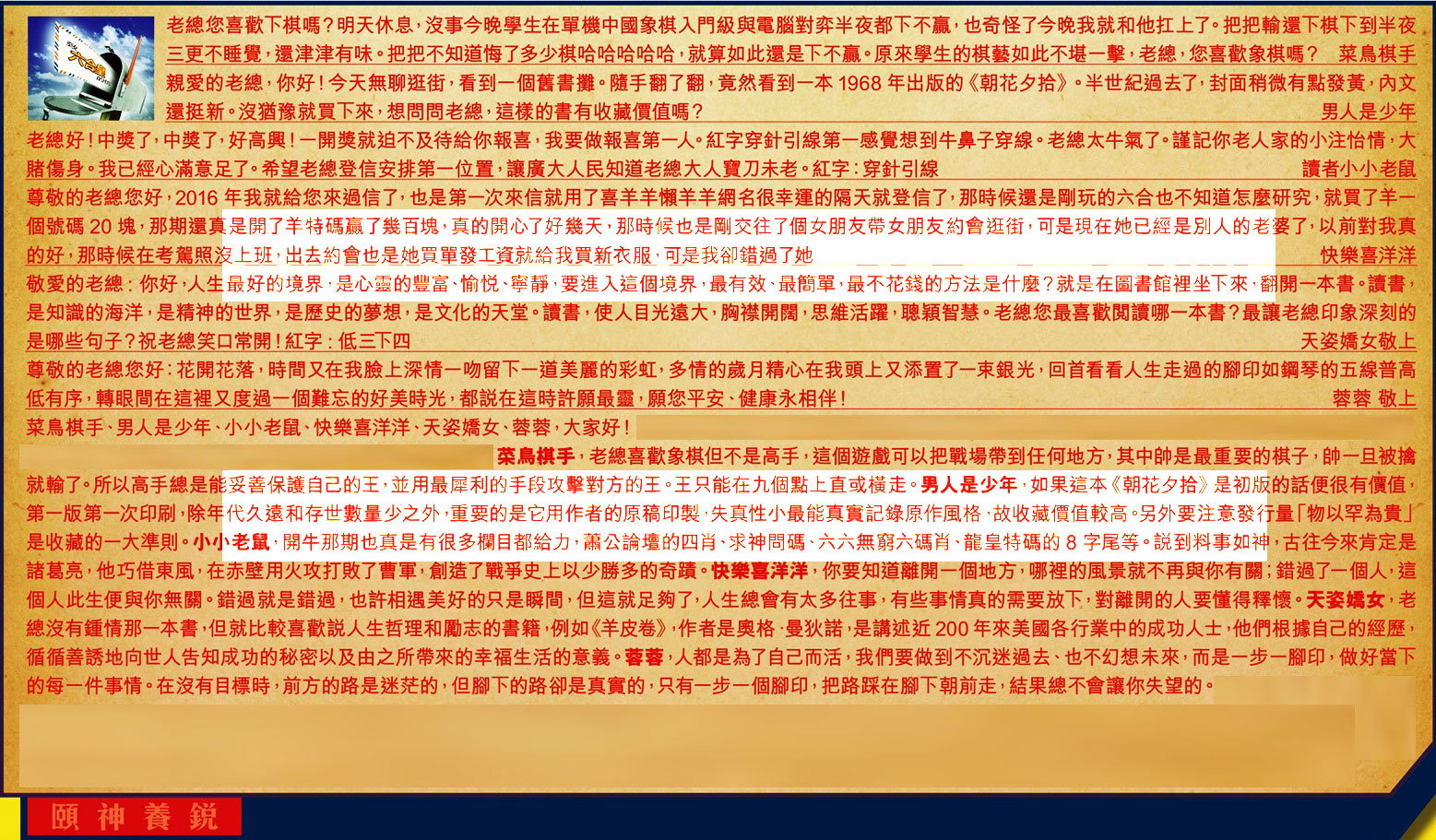 【1】.老總您喜歡下棋嗎?明天休息,沒事今晚學生在單機中國象棋入門級與電腦對弈半夜都下不赢,也奇怪了今晚我就和他扛上了。把把輸還下棋下到半夜三更不睡覺,還津津有味。把把不知道悔了多少棋哈哈哈哈哈,就算如此還是下不赢。原來學生的棋藝如此不堪一擊,老總,您喜歡象棋嗎? 菜鳥棋手