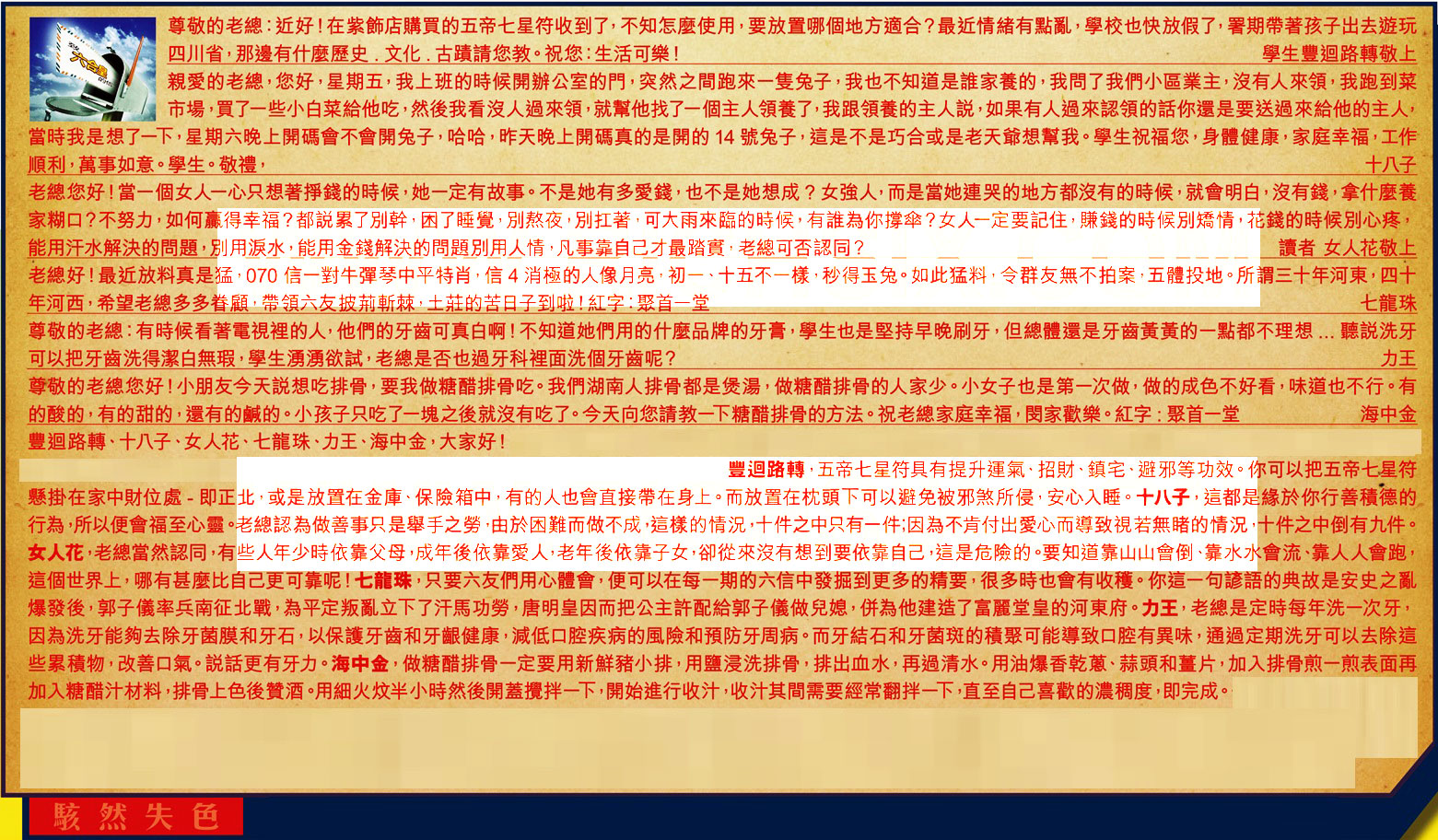 【2】.親愛的老總,您好,星期五,我上班的時候開辦公室的門,突然之間跑來一隻兔子,我也不知道是誰家養的,我問了我們小區業主,沒有人來領,我跑到菜市場,買了一些小白菜給他吃,然後我看沒人過來領,就幫他找了個主人領養了,我跟領養的主 人說,如果有人過 來認領的話你還是要送過來給他的主人,當時我是想了一下,星期六晚上開碼會不會開兔子,哈哈,昨天晚上開碼真的是開的 14 號兔子,這是不是巧合或是老天爺想幫我。學生祝福您,身體健康,家庭幸福,工作順利,萬事如意。學生。敬禮, 十八子