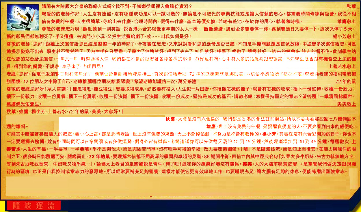 【5】.老總:您好,從電子版瀏覽三報有些年頭了;偶爾也會斷斷續續費沒接上,首次寫信給老總,72年的鼠運氣總是那麼差,六信悟不透悟透了把握不定,望透過老總的指引帶我擺脱困境,12位朋友之中除了自己,老總推薦哪位朋友給我認識?希望老總能護佑一次,萬分感謝! 72年的鼠