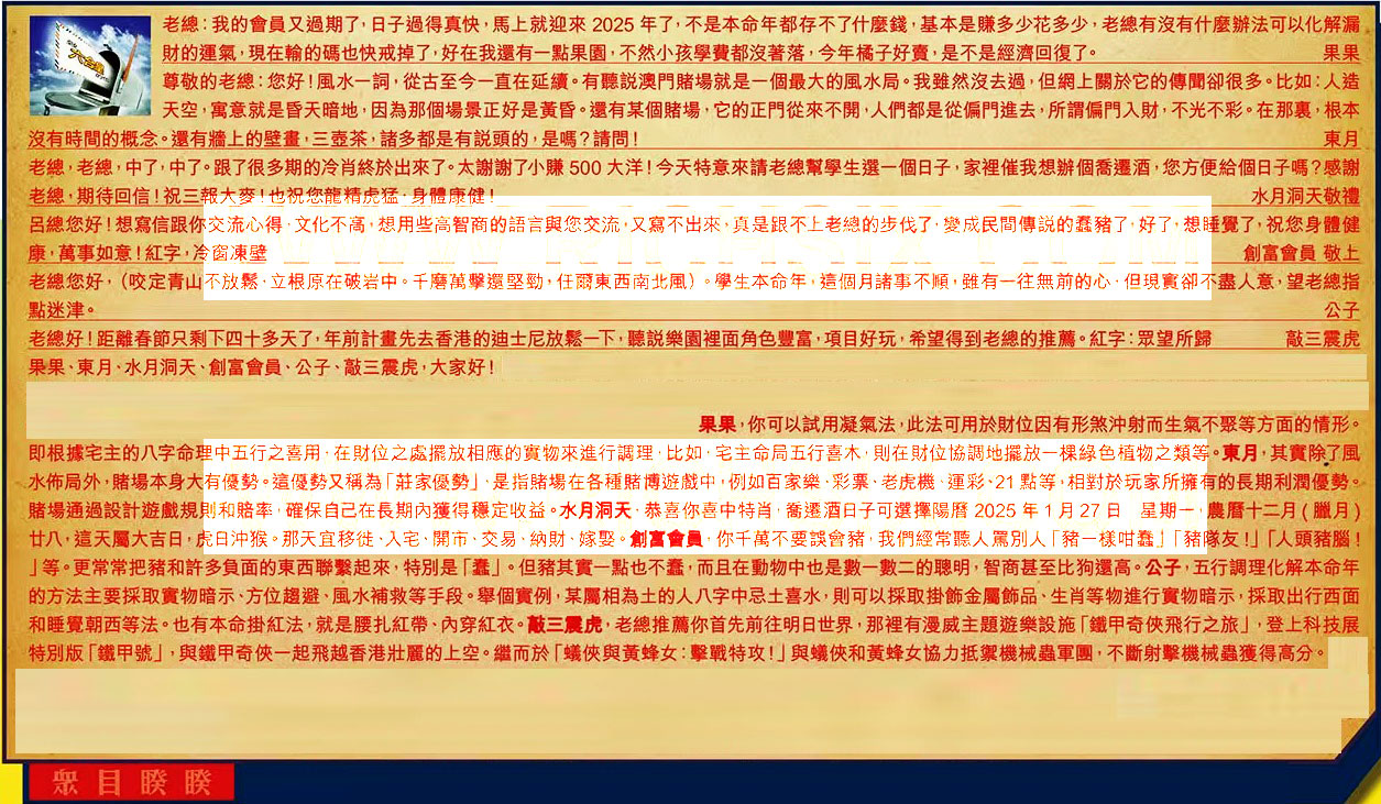 【6】.老總好!距離春節只剩下四十多天了,年前計畫先去香港的迪士尼放鬆一下,聽說樂園裡面角色豐富,項目好玩,希望得到老總的推薦。紅字:眾望所歸  敲三震虎