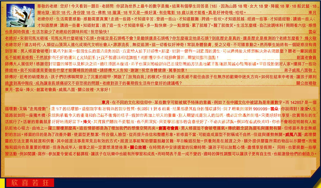 【1】.尊敬的老總:您好!今天看到一題目,老師問:你認為世界上最牛的數字是幾。結果有個學生回答是(18),因為山路18彎,女大18變,降龍18掌,18般武藝,18層地獄,祖宗18代,身份證18位,佛教18羅漢,18年又是一條好漢,有些電影18歲以後才能看。真是好神奇哦,哈哈。 東月