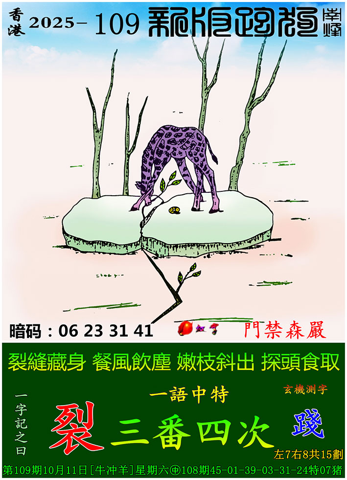主题 : 109期:新版跑狗一字記之曰【裂】 玄機測字:【踐】