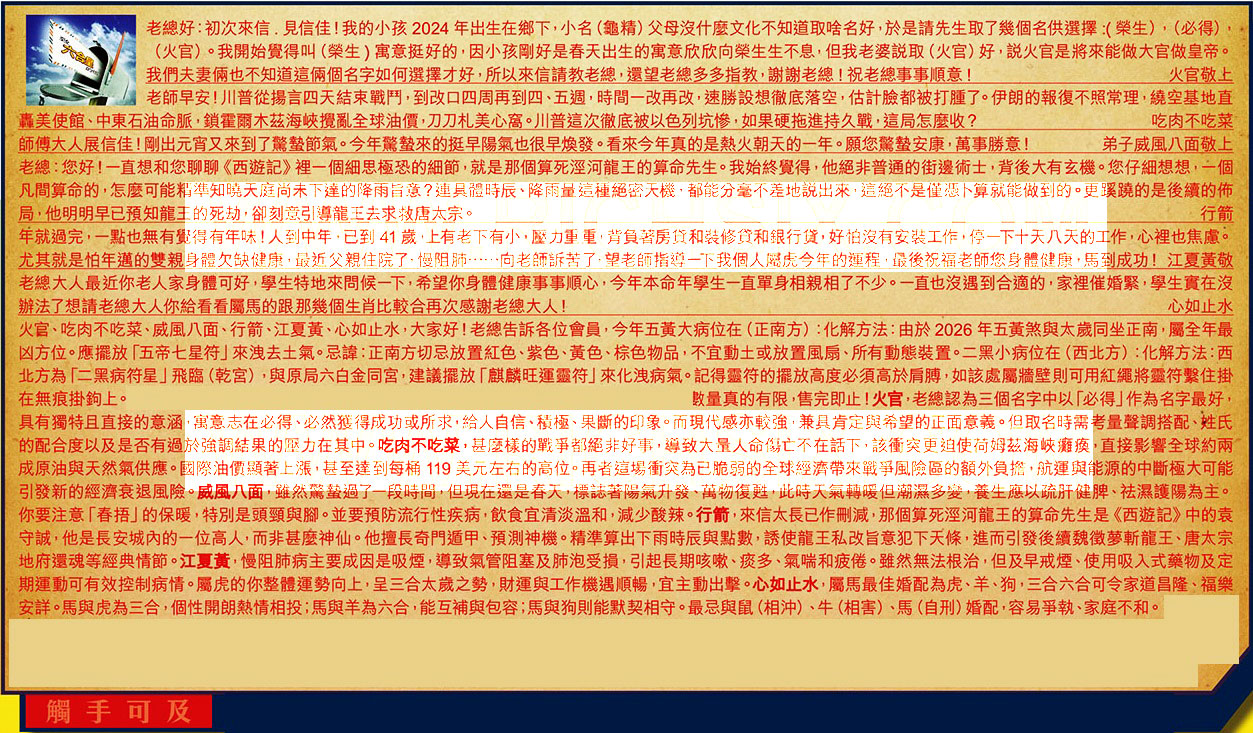 【1】.老總好:初次來信.見信佳!我的小孩2024年出生在鄉下,小名、(龜精)父母沒什麼文化不知道取啥名好,於是請先生取了幾個名供選擇:(榮生),(必得),(火官)。我開始覺得叫(榮生)寓意挺好的,因小孩剛好是春天出生的寓意欣欣向榮生生不息,但我老婆説取(火官)好,説火官是將來能做大官做皇帝。我們夫妻俩也不知道這俩個名字如何選擇才好,所以來信請教老總,還望老總多多指教,谢謝老總!祝老總事事順意!  火官敬上