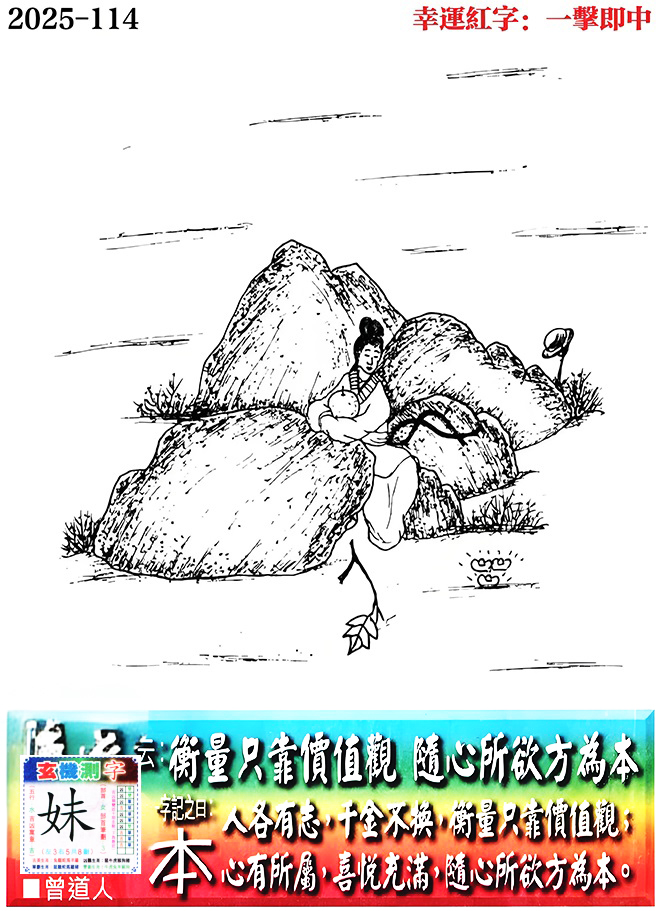 | 主题 :114期老版跑狗一字記之曰:【本】 玄機測字:《妹》 |